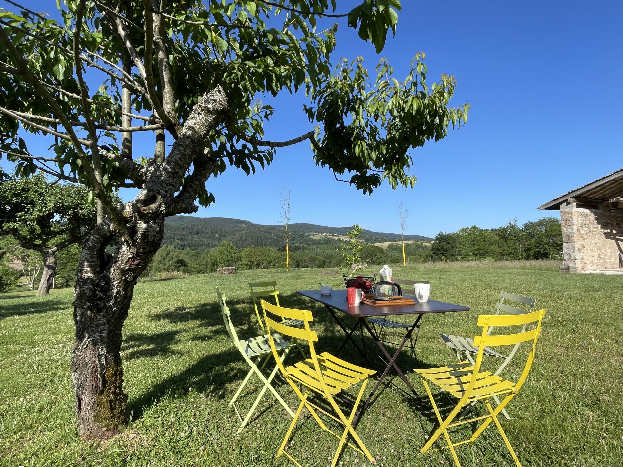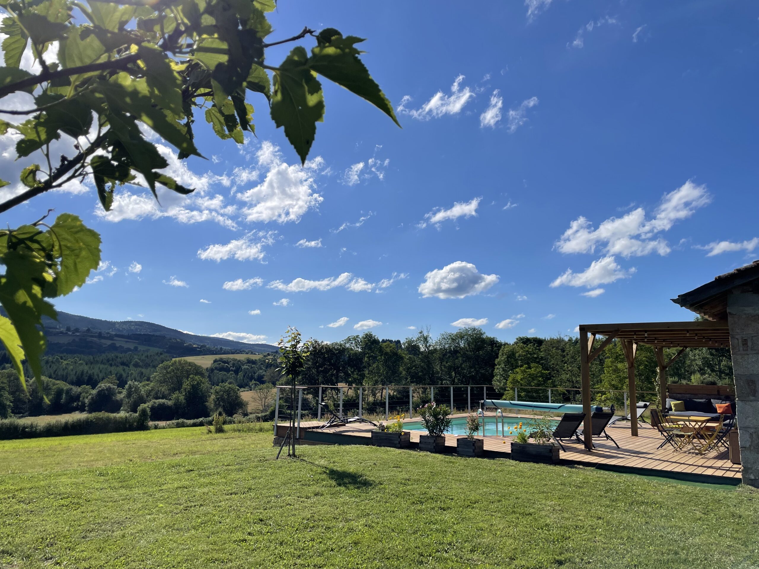 A l’extérieur, une piscine de 8 x 4 x 1,30 m intégrée dans une terrasse sur pilotis de 100 m2 surplombe 2 hectares de prairie et vous offre une vue imprenable sur les Bois Noirs, sans vis à vis, dans un écrin de verdure. Devant la maison, vous profitez d’une grande esplanade arborée où vous pourrez prendre l’apéro sous un bosquet de frênes, déjeuner sous l’appentis à l’abri du soleil ou faire une partie de molky quelque part dans les deux hectares de prairie.