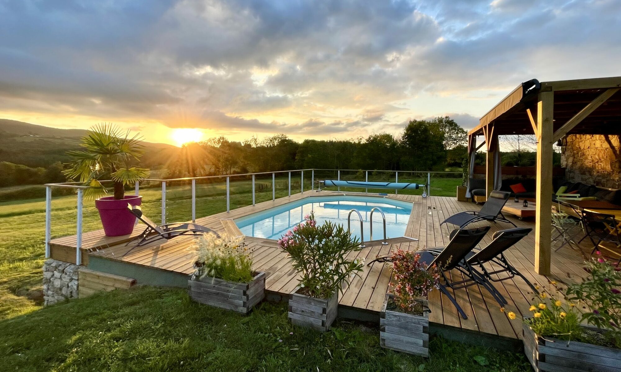 - La piscine est remplie grâce à une citerne de récupération d’eau de pluie. Elle est traitée au sel et est sécurisée par un garde corps et une barrière amovible. Sa profondeur est d’1,20m environ. Elle n’est pas chauffée, mais sa faible profondeur lui permet d’atteindre facilement 26-28°C l’été.