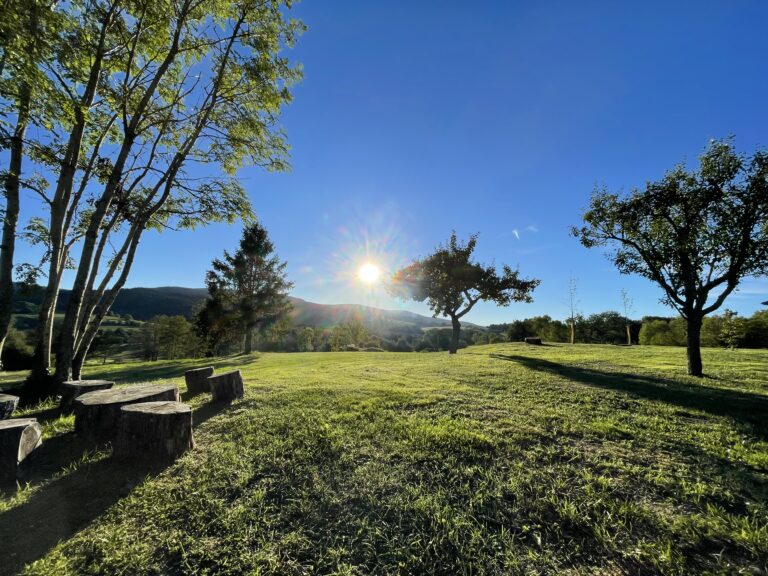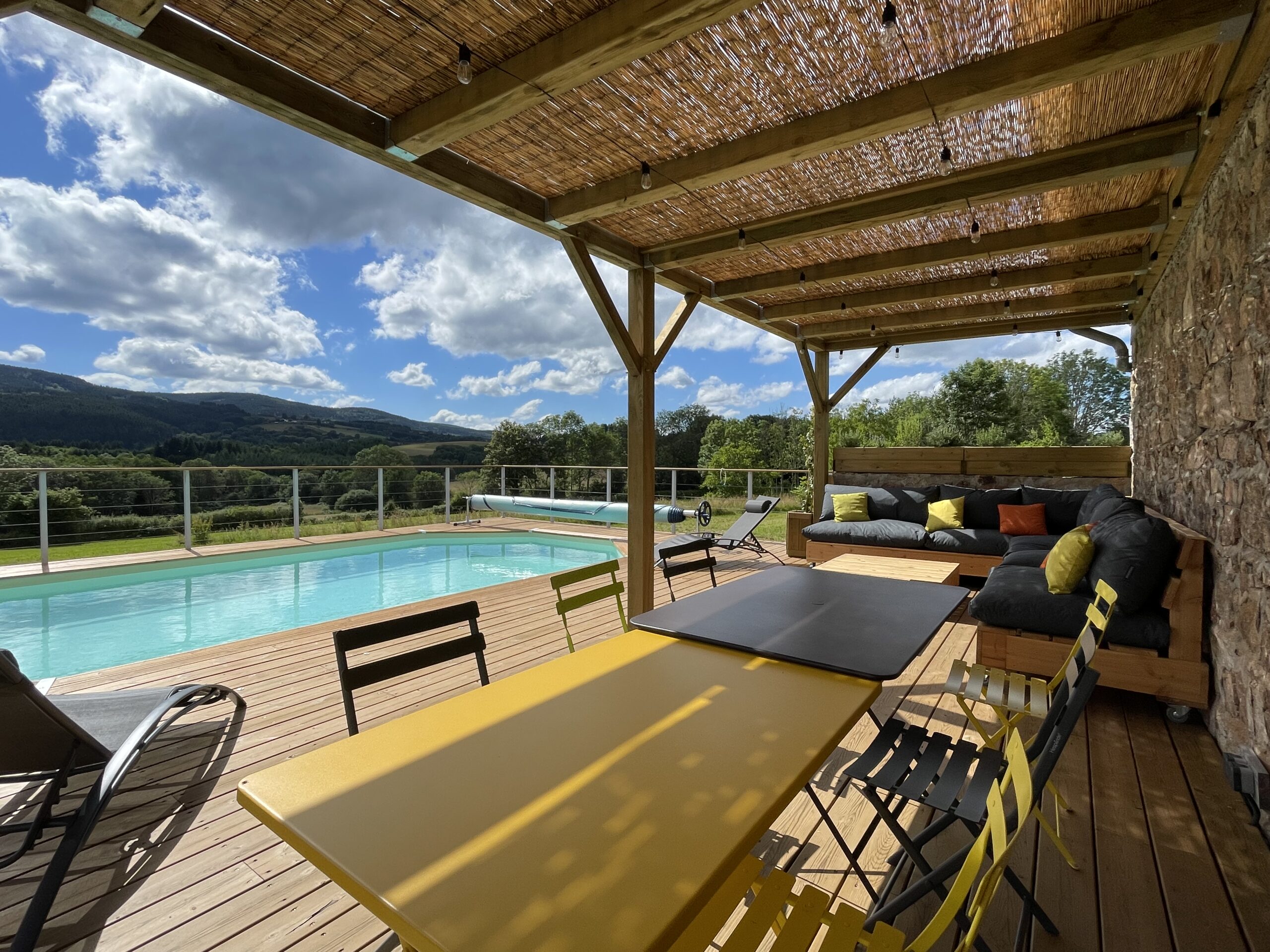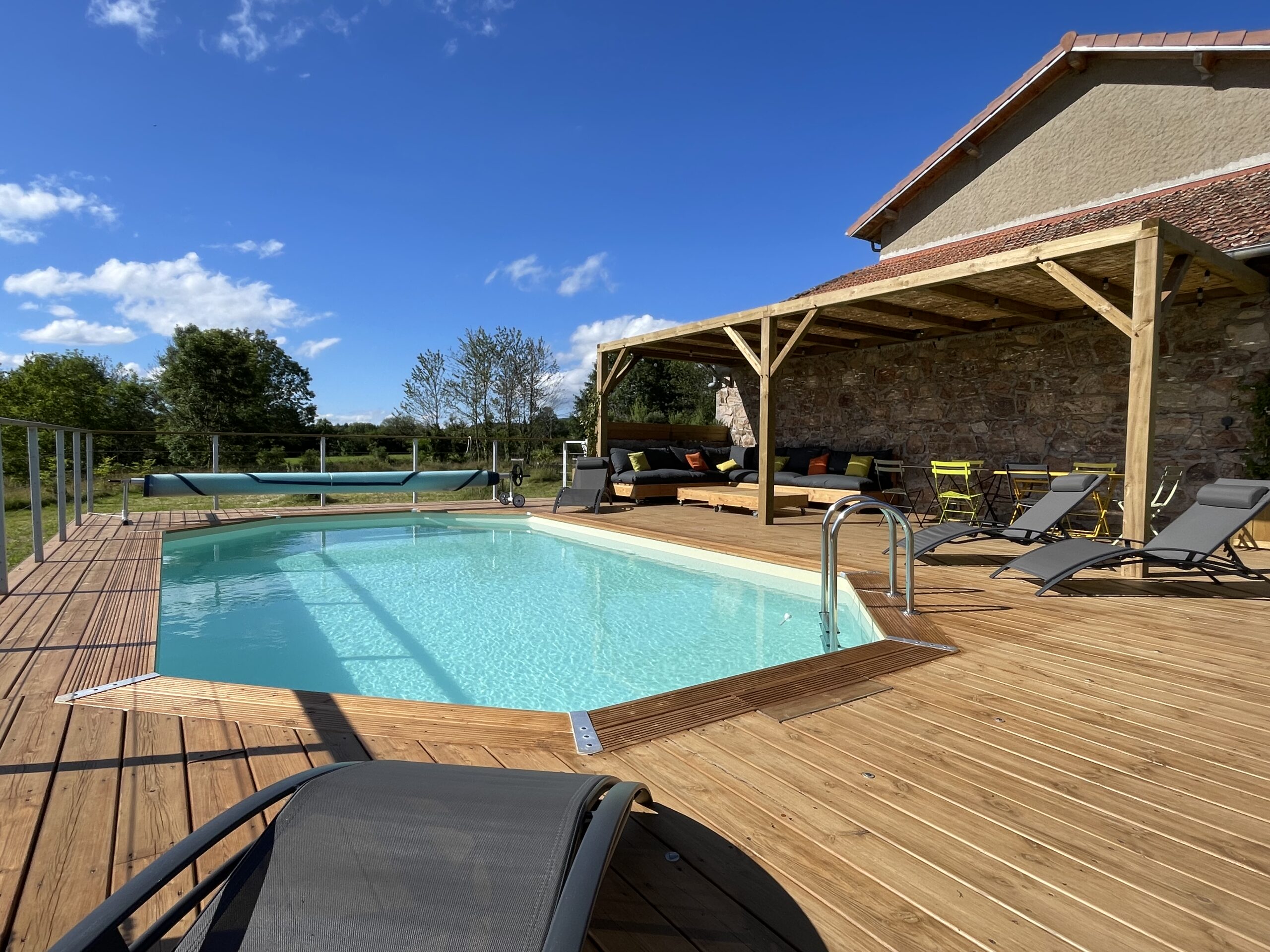 A l’extérieur, une piscine de 8 x 4 x 1,30 m intégrée dans une terrasse sur pilotis de 100 m2 surplombe 2 hectares de prairie et vous offre une vue imprenable sur les Bois Noirs, sans vis à vis, dans un écrin de verdure. Devant la maison, vous profitez d’une grande esplanade arborée où vous pourrez prendre l’apéro sous un bosquet de frênes, déjeuner sous l’appentis à l’abri du soleil ou faire une partie de molky quelque part dans les deux hectares de prairie.